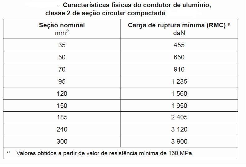 O condutor deve ser constituído por: alumínio, classe 2 de encordoamento, de seção circular compactada, conforme a NBR NM 280. A resistência mínima à tração dos fios de alumínio, antes do encordoamento, deve ser adequada, a fim de atender à carga de ruptura mínima do condutor indicada na tabela abaixo. Ou cobre mole, com ou sem revestimento, classe 2 de encordoamento, de seção circular compactada, conforme a NBR NM 280, nas seções padronizadas de 16 mm², 25 mm², 35 mm², 50 mm² e 70 mm².
