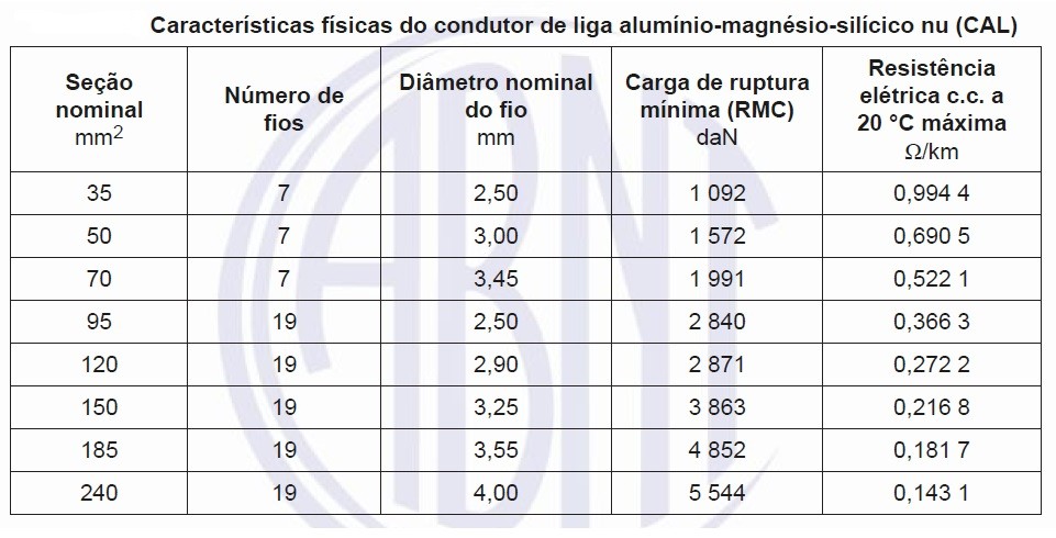 Ou alumínio com alma de aço zincado (classe 1) ou com alma de aço revestido de alumínio (CAA ou CAA-RA), conforme a NBR 7270 ou NBR 10841, nas seções padronizadas (Al/aço) de 21,18/3,53; 33,59/5,60; 53,52/8,92; 67,33/11,22; 107,22/17,27; 134,87/21,99; 170,55/27,83; 201,34/32,73 e 241,65/39,49 mm2. Ou liga alumínio-magnésio-silício (CAL), conforme a NBR 10298, com características especificadas na tabela abaixo, nas seções padronizadas de 35 mm² a 240 mm². Outros tipos de condutores também podem ser utilizados, desde que suas características e requisitos sejam acordados entre o fabricante e o comprador.