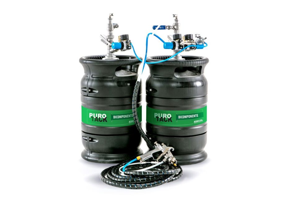 Desenvolvido após inúmeros testes e pesquisas, o Purotack Bicomponente é elaborado à base de dispersões aquosas de policloropene e projetado para colagens de espumas em outros substratos. Sua apresentação comercial contém um barril de adesivo e outro de catalizador, que são misturados apenas no momento da aplicação e permite que o usuário regule a proporção adesivo/catalizador conforme sua demanda. Um dos seus principais diferenciais é o tempo de secagem extremamente reduzido, que consequentemente reduz também o tempo de todo o processo de produção.