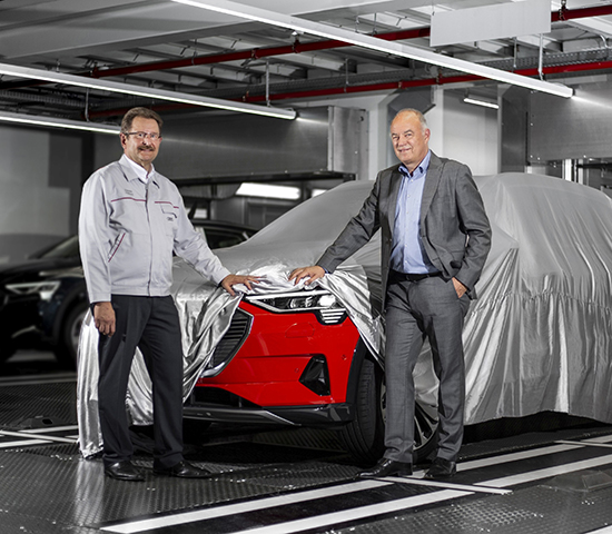 Na cor Vermelho Misano e pronto para a estrada: o membro do Conselho de Administração para Produção e Logística da Audi AG, Peter Kössler, e Patrick Danau, diretor executivo da Audi Bruxelas, não resistiram em ver as primeiras unidades do e-tron saírem da linha de montagem. “O Audi e-tron é um pioneiro genuíno”, afirmou Kössler. “Ele apresenta tecnologias inovadoras, como espelhos retrovisores virtuais, e combina as qualidades tradicionais da marca em dirigibilidade e dinâmica, com o avanço técnico que vai muito além do veículo. Nossa fábrica de Bruxelas foi amplamente modernizada para a fabricação do carro elétrico. Essa é a primeira produção mundial em massa com certificação de CO2 neutro no segmento premium.” A Audi Bruxelas compensa todas as emissões produzidas no local, principalmente usando energia de fontes renováveis, mas também por meio de projetos ambientais.