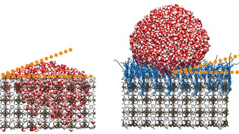 Esquerda: Substrato poroso com um pequeno ângulo de contato com a água: A superfície absorve muito líquido. Direita: O novo material apresenta um...