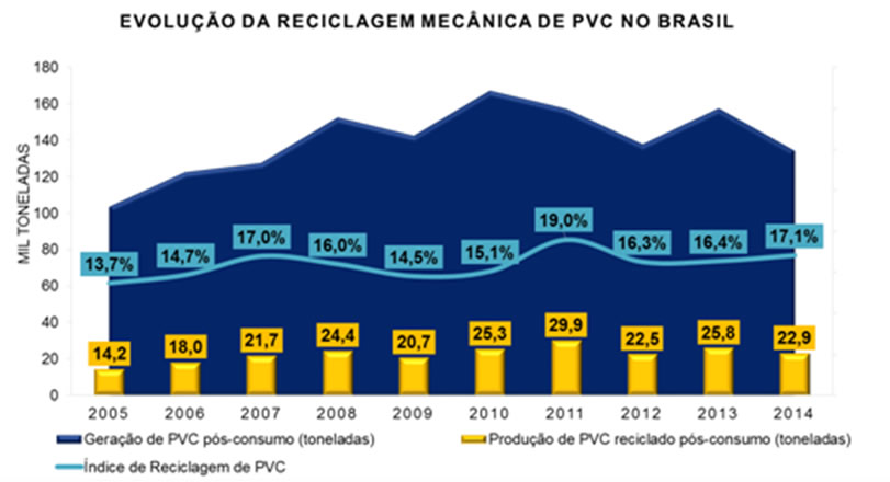 De 2005 a 2014, a quantidade de PVC pós-consumo gerado aumentou em média 3% ao ano. Considerando-se o mesmo período observa-se que o crescimento do volume de PVC reciclado (11%) é maior que o aumento do volume de PVC pós-consumo gerado, o que é extremamente positivo e traz um consequente aumento do índice de reciclagem mecânica do PVC. Esses dados mostram que a quantidade de PVC não reciclado e destinado a aterros diminuiu. A redução na destinação de recicláveis em aterros é um dos objetivos da PNRS.