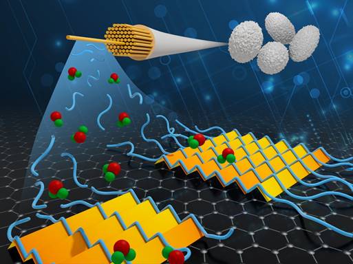 A deposição controlada de fibras de seda viabiliza a produção de vários dispositivos eletrônicos biodegradáveis. A ilustração mostra as fibroínas (azul) sendo depositadas sobre grafeno em ambiente aquoso (esferas verdes e vermelhas), gerando uma folha 2D precisa.