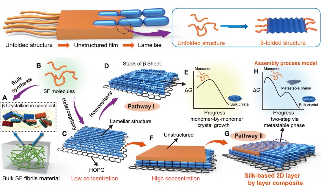 Para fazer isso, a equipe controlou cuidadosamente as condições da reação, adicionando fibras de seda individuais ao sistema à base de água de maneira precisa, precisa o suficiente para produzir uma camada 2D altamente organizada de proteínas empacotadas em folhas do tipo beta – folha-beta é uma das formas de proteína mais comuns na natureza, um padrão estrutural nos quais regiões vizinhas compartilham ligações de hidrogênio, resultando em uma estrutura achatada e rígida.