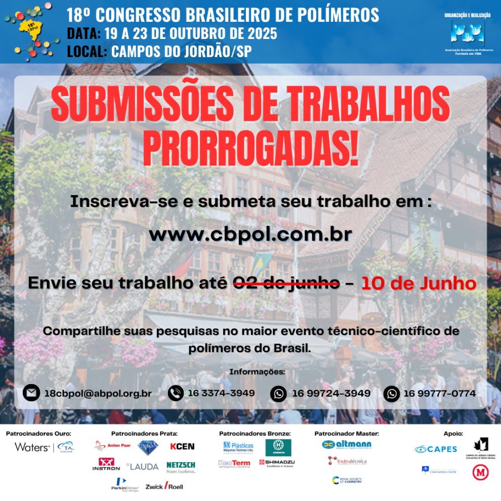 A Abpol informa que o prazo para submissão de trabalhos ao 18º Congresso Brasileiro de Polímeros (CBPol), inicialmente previsto para o dia 2 de junho de 2025, foi prorrogado até o dia 10 de junho de 2025. A decisão visa atender a solicitações da comunidade científica e oferecer mais tempo para a finalização e envio dos resumos. Reforçamos que essa será a data limite para submissões, sem nova prorrogação.