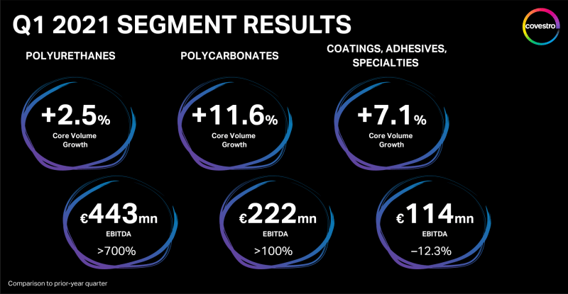 No primeiro trimestre de 2021, os volumes principais de vendas do segmento de policarbonatos cresceram 11,6% em comparação com o primeiro trimestre do ano anterior. Isso pode ser atribuído à subida contínua da demanda e à expansão dos volumes principais de vendas, especialmente na região APAC. As vendas cresceram 21,3% para 889 milhões de euros, em grande parte impulsionadas pelo aumento nos preços médios de venda, devido a uma situação concorrencial favorável e aos altos volumes vendidos. Isso levou a um aumento do EBITDA em relação ao trimestre do ano anterior, para 222 milhões de euros (ano anterior: 109 milhões de euros). Um aumento nas provisões para compensação variável reduziu os lucros.
