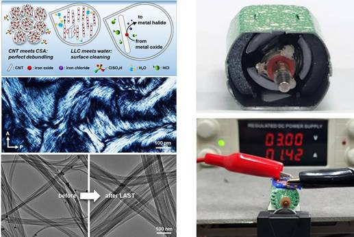 Ryu e seus colegas desenvolveram então um novo processo de purificação dos nanotubos de carbono que utiliza o princípio de alinhamento dos cristais líquidos. O processo resolve naturalmente a forte agregação durante o alinhamento dos nanotubos, removendo as partículas metálicas que permanecem em sua superfície. O nível de contaminação por metais caiu dos 12,7% iniciais para menos de 0,8%.