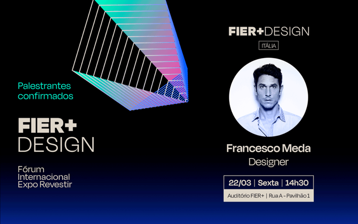 A Expo Revestir será realizada de 19 a 22 de março de 2024 no São Paulo Expo, em São Paulo, SP, e mostrará o design Italiano com Francesco Meda, palestrante confirmado no FIER+ Design, que acontece dia 22/03, às 14h30, durante a Expo Parte da programação do FIER+ Design. O renomado designer italiano Francesco Meda traz em seu portfólio marcas líderes do design internacional tais como Kartell, Vitra,Alessi, Ferragamo e a inovadora Volta Footwear.