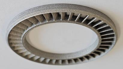 O protótipo só imprime peças de até 20cm de diâmetro, mas a equipe já está trabalhando em uma versão maior. Este estator de turbina de alta pressão tem diâmetro de 75 mm.