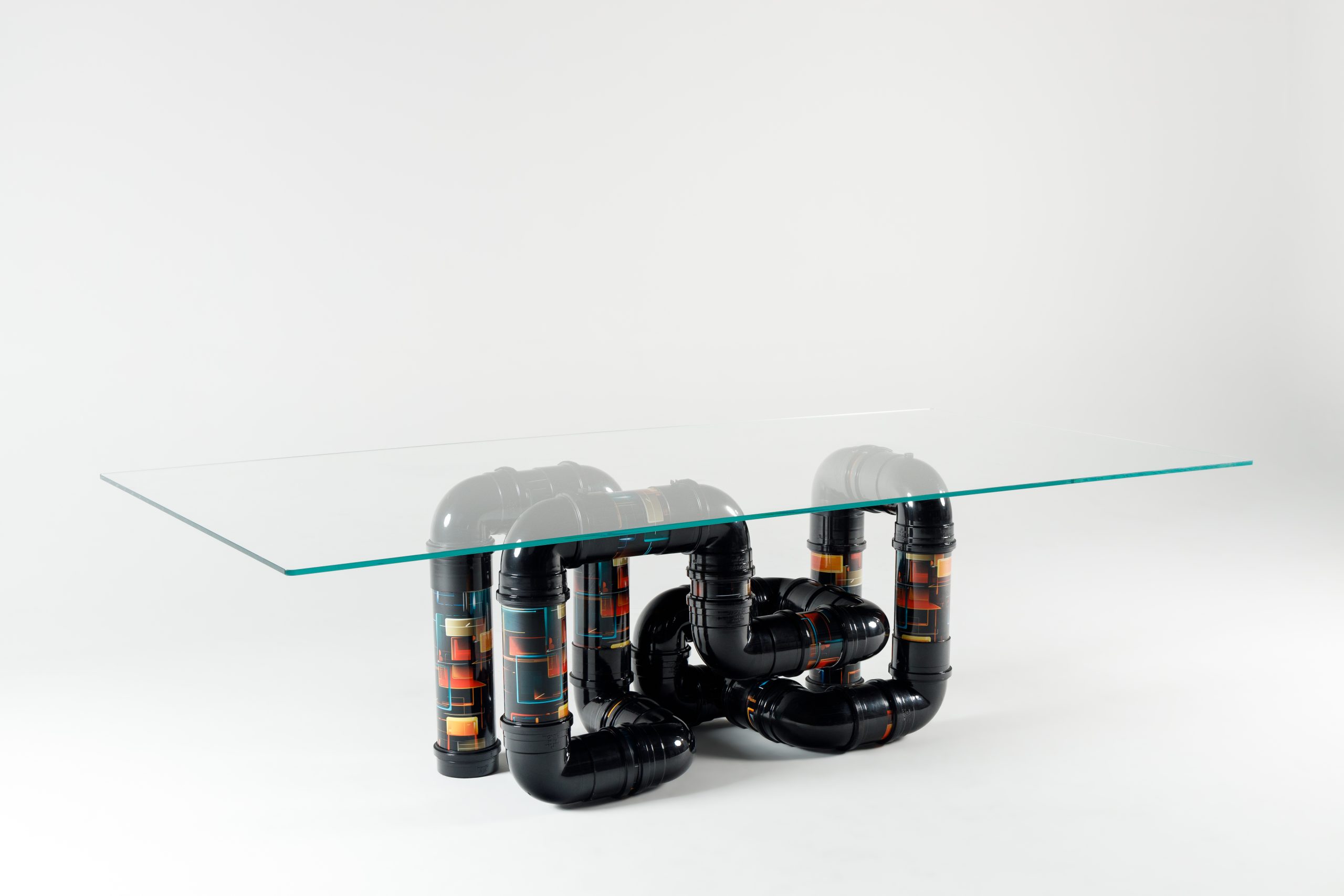 A mesa de jantar Conexão 08 impressiona pelo equilíbrio entre forma e funcionalidade. Sua base sinuosa, feita de tubos cuidadosamente projetados, suporta um tampo de vidro de grandes dimensões (2,60m x 1,30m) e 140 kg, com estabilidade e elegância. O design desafia o observador e provoca a imaginação.