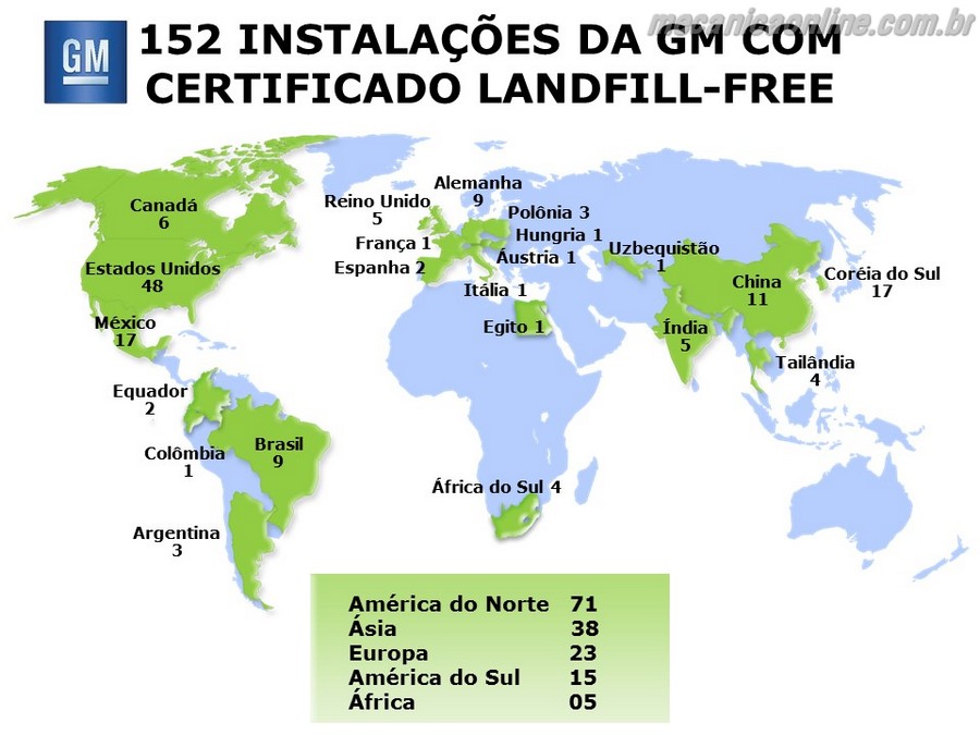 Instalações aterro zero foram adicionadas esse ano na Ásia, África, América do Norte e América do Sul: • Fábrica de motores, centro de distribuição de peças e operação de estamparia em Talegaon, Índia • Fábrica de sistemas de propulsão em Romulus, armazém em Flint, operação pós-vendas em Madison Heights, armazém em Grand Blanc, Michigan • Centro de distribuição em Charlotte, Carolina do Norte • Centro de distribuição de peças e manufatura em Quito, Equador • Fábrica em Cairo, Egito • Duas fábricas e dois centros de distribuição em Port Elizabeth, África do Sul • Sede da GM Canadá em Oshawa, Canadá • Fundição em Toluca, México • Fábrica de veículos, fábrica de peças plásticas, centro tecnológico, engenharia e escritório em São Caetano do Sul, Brasil • Fábrica em Bogotá, Colômbia