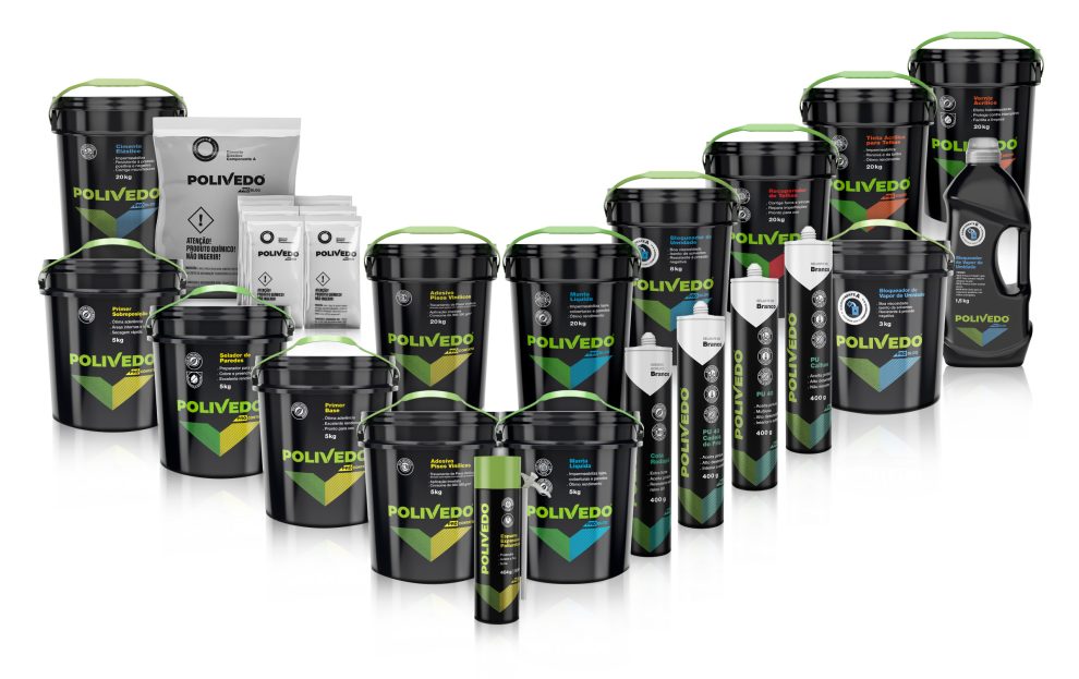 O portfólio Polivedo é formado por impermeabilizantes, colas, selantes, silicones espuma expansiva, manta líquida, primers, bloqueador de vapor de umidade, cimento elástico e tinta emborrachada, divididos em três linhas, conforme a aplicação: Impermeabilizantes, Selantes e Pisos Vinílicos.