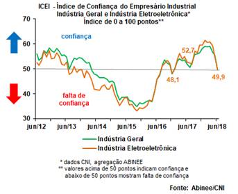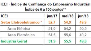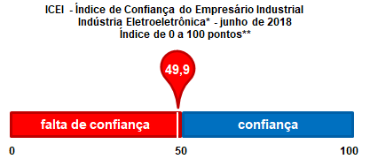 O Índice de Confiança do Empresário Industrial (ICEI) do setor eletroeletrônico, conforme dados da Confederação Nacional da Indústria (CNI) agregados pela Associação Brasileira da Indústria Elétrica e Eletrônica (Abinee), atingiu 49,9 pontos em junho de 2018, recuando 5 pontos em relação ao mês imediatamente anterior (54,9 pontos).