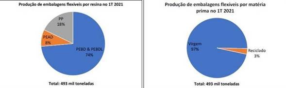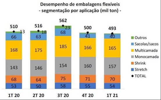 Assim, estima-se que no primeiro trimestre de 2021 a indústria de embalagens flexíveis tenha apresentado produção inferior ao trimestre anterior, com uma queda aproximada de 1%, fechando em 493 mil toneladas produzidas. Por aplicação, este volume foi dividido em embalagens multicamadas, com 165 mil ton; monocamada, 157 mil ton; shrink, 70 mil ton; stretch, 54 mil ton; sacolas e sacos, 40 mil ton; outros, 7 mil ton.