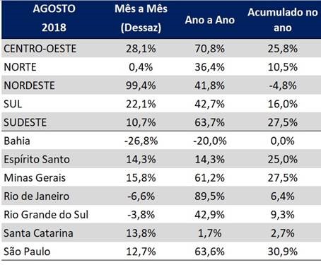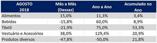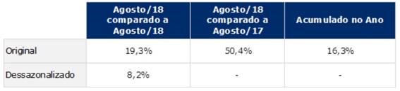 O Índice GS1 Brasil de Atividade Industrial apresentou crescimento de 8,2% na comparação com o mês anterior no dado dessazonalizado. Na comparação com o mesmo mês do ano anterior, o indicador apresentou aumento de 50,4%. O índice original cresceu 16,3% no acumulado de janeiro a agosto de 2018, quando comparado com o mesmo período do ano passado.