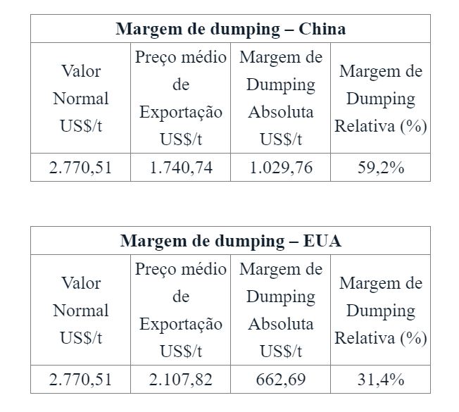A petição foi apresentada pela Dow Brasil Sudeste Industrial Ltda. A análise das evidências de dumping considerou o período de abril de 2022 a março de 2023 e a análise de dano considerou o período de abril de 2018 a março de 2023. Para fins de início da investigação foram apuradas as seguintes margens de dumping absoluta e relativa para China e EUA: