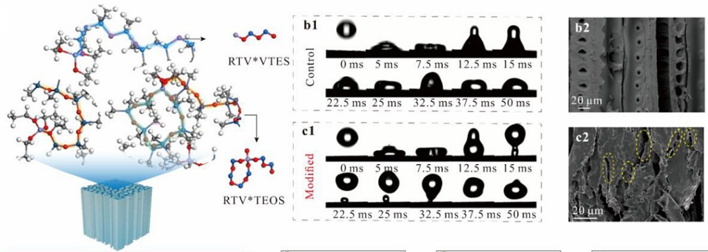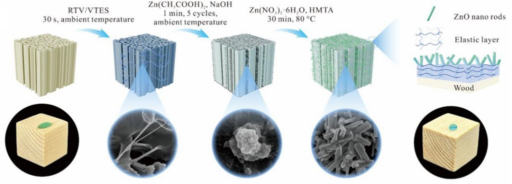 A técnica começa com as peças de madeira sendo mergulhadas em uma solução de silicone de baixo custo, essencialmente uma vulcanização à temperatura ambiente, promovida por um agente de reticulação e pelo composto vinil-trietoxisilano (VTES), criando uma interfase elastomérica sobre a madeira.