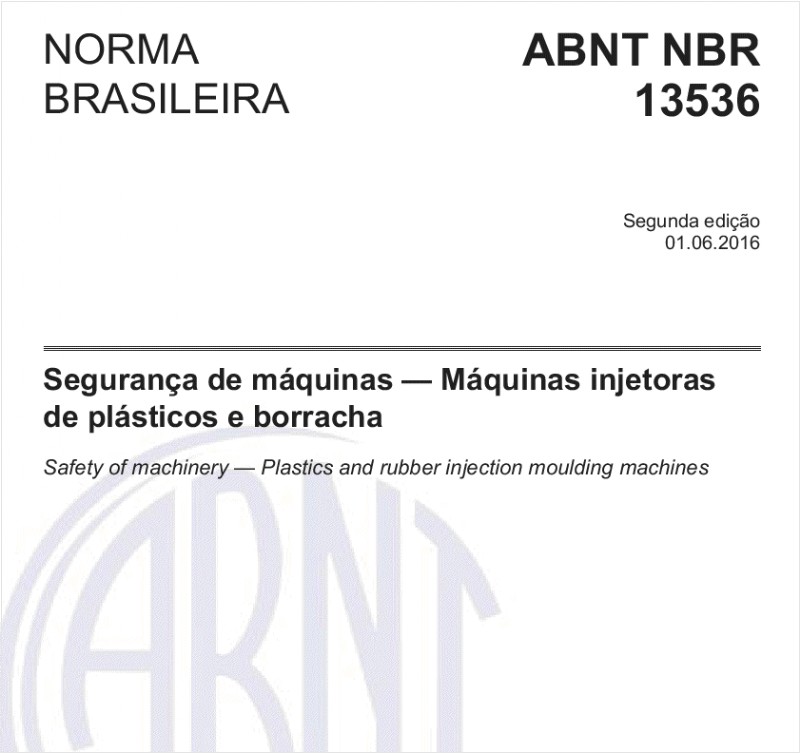A NBR 13536 de 06/2016 – Segurança de máquinas — Máquinas injetoras de plásticos e borracha especifica requisitos de segurança essenciais para o projeto e construção de máquinas injetoras de plásticos e borracha e provê informação para seu uso seguro. Esta norma é aplicável apenas às máquinas injetoras com acionamento hidráulico ou elétrico.