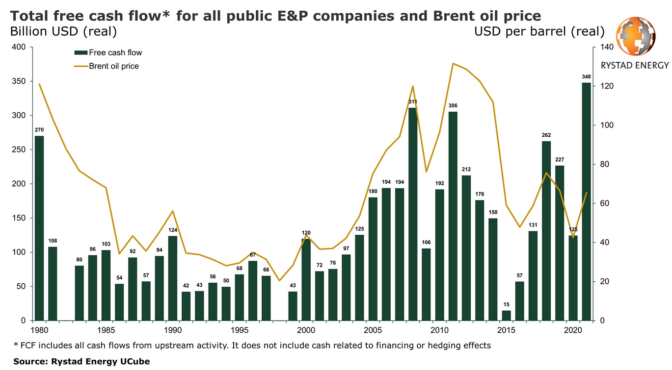 O preço do barril de petróleo na última semana atingiu valores não vistos desde 2018, voltando a tocar no patamar de US$ 75. Com a recente subida do preço da commodity, as empresas mundiais de exploração e produção (E&P) de capital aberto devem gerar um fluxo de caixa livre recorde em 2021. A projeção foi feita em um novo relatório da Rystad Energy. O fluxo de caixa combinado dessas empresas deve bater os US$ 348 bilhões neste ano, uma alta considerável de 178,4% em comparação com o patamar de 2020 (US$ 125 bilhões). Este montante é o maior desde o início da série histórica, iniciada em 1980. Há também sinais de que muitas empresas estão começando a retomar atividades e novos investimentos, após o baque sofrido pela indústria após o início da pandemia de Covid-19.