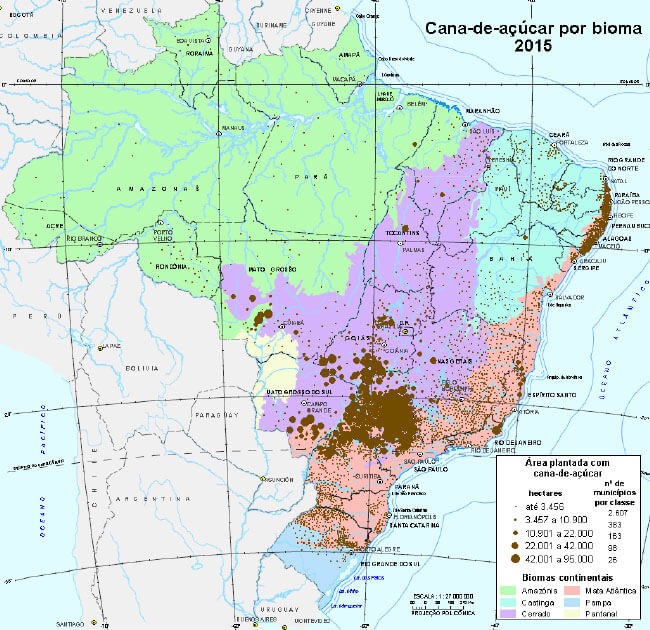 Embora a Mata Atlântica ainda seja o bioma onde a cana está mais presente, a área plantada no Cerrado aumentou consideravelmente na última década. Por isso, o Cerrado do estado de São Paulo, que representa somente 1% do território nacional, concentra nada menos do que 1/3 de toda a área de cultivo da cana no país. No entanto, em todas as Unidades da Federação há canaviais, alimentando inúmeros empreendimentos e formas de produção, desde forragem para gado até fabricação de papel.