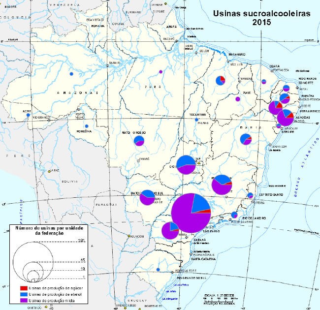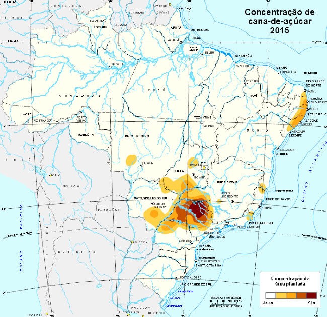 Essas análises mostram que há dois grandes complexos regionais sucroenergéticos: o da Costa Nordestina e o da Bacia do Paraná (entendida no sentido geológico, ou seja, bacia sedimentar). Esses dois complexos são constituídos por diferentes combinações de fatos físicos e humanos, contrastando em termos de produtividade agrícola, grau de uso de insumos, estruturas logísticas e estruturação dos circuitos espaciais, entre outras características. (IBGE)