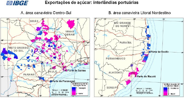 Também é feito um exercício de regionalização das hinterlândias portuárias (área geográfica servida por um porto e a este conectada por uma rede de transportes) relacionadas ao escoamento do açúcar e do etanol do Brasil para o exterior. Uma das revelações é que as hinterlândias açucareiras do Porto de Santos e do Porto de Paranaguá se sobrepõem, mas a influência de Paranaguá penetra no estado de São Paulo.