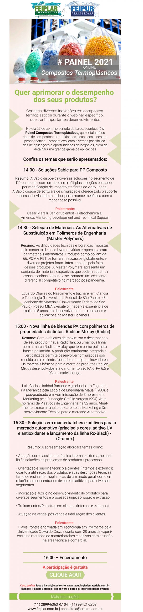 No dia 27 de abril, das 14h às 16h, acontecerá o Painel Compostos Termoplásticos, que detalhará os tipos de compostos termoplásticos, seus usos e desempenho técnico. Também explicará diversas possibilidades de aplicações e oportunidades de negócios, além de detalhar uma grande gama de aplicações.