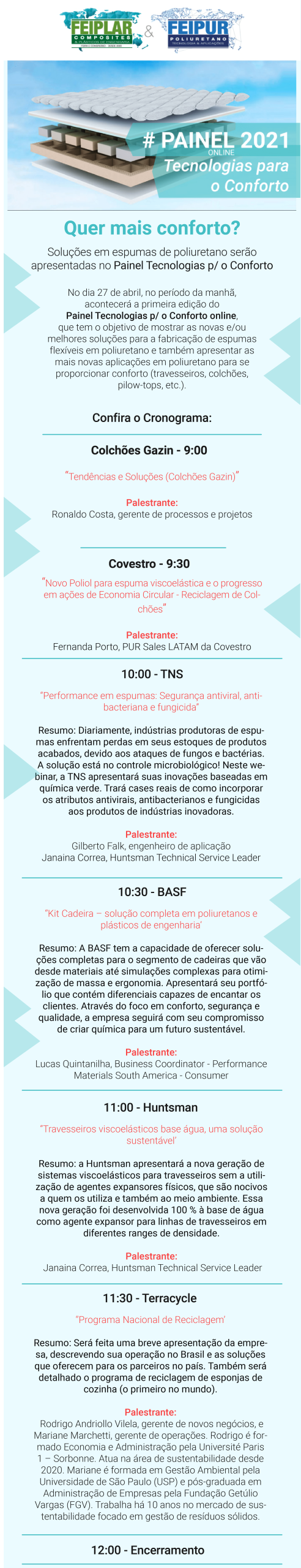 Amanhã, dia 27 de abril, das 9h às 12h, acontecerá a primeira edição do Painel Tecnologias p/ o Conforto online, que tem o objetivo de mostrar as novas e/ou melhores soluções para a fabricação de espumas flexíveis em poliuretano e também apresentar as mais novas aplicações em poliuretano para se proporcionar conforto (travesseiros, colchões, pilow-tops, etc.).
