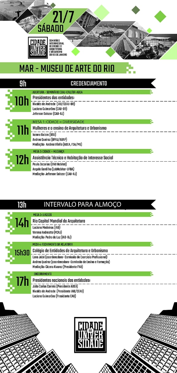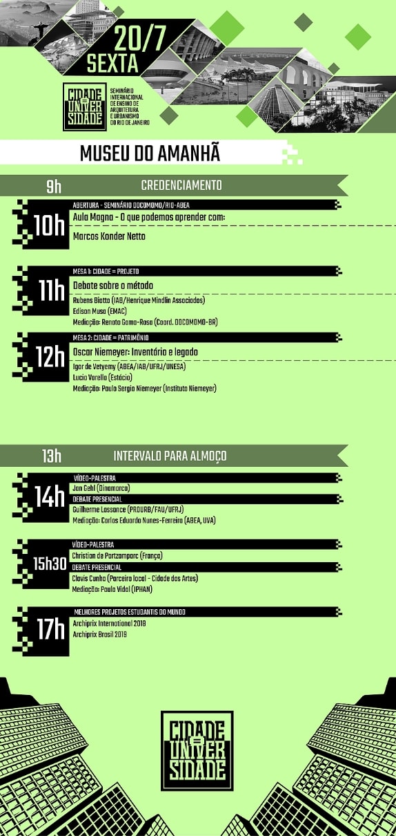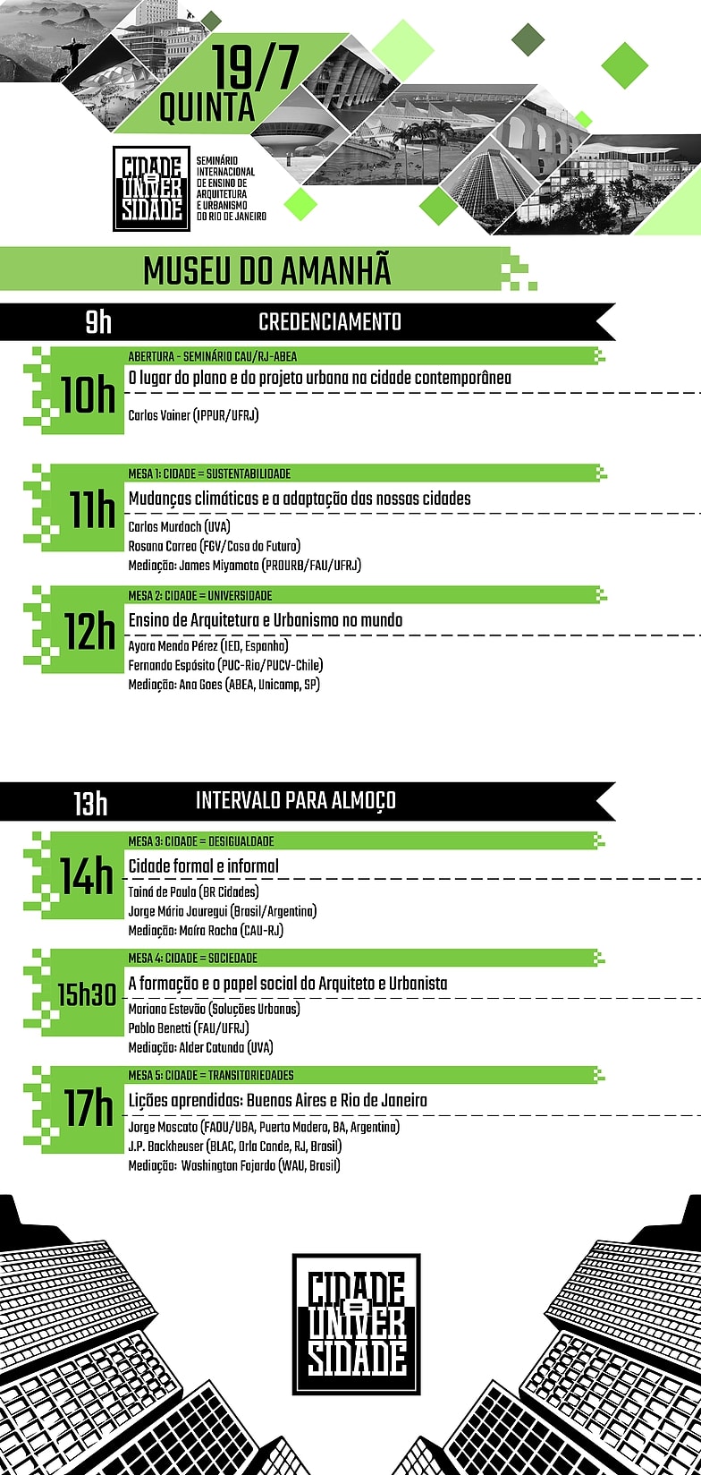 O Rio de Janeiro irá receber o Cidade = Universidade, seminário internacional de ensino de arquitetura e urbanismo, um dos maiores eventos do campo do mundo. O seminário, que ocorre entre os dias 19 e 21 de julho, no Museu do Amanhã e no Auditório do Mar, é gratuito e contará com a presença de grandes nomes da área como o arquiteto e professor argentino Jorge Moscato, responsável pela revitalização do Puerto Madero, em Buenos Aires, e João Pedro Backheuser, responsável pelo projeto da Orla Conde e da Praça Mauá, na região portuária do Rio de Janeiro.