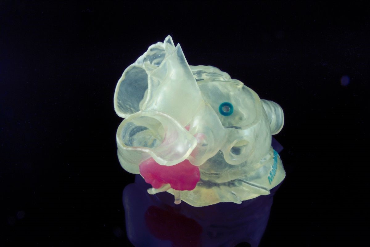 Modelo de apêndice atrial esquerdo (AAE) de um paciente, criado com a tecnologia da Stratasys e Materialise, que permite que os cirurgiões selecionem o dispositivo apropriado e planejem a abordagem ideal para tratamentos diversos. Imagem fornecida pela Materialise.