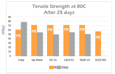 Analisando a tabela e o gráfico acima, pode-se observar que a poliamida tem uma certa resistência química, porém a policetona consegue resistir a mais compostos químicos, como fluidos automotivos, solventes de hidrocarbonetos, sais, ácidos e bases fracos. E que a resistência à tração do PK não é tão afetada mesmo se entrar em contato com produtos químicos após alguns dias, ao contrário do PA.