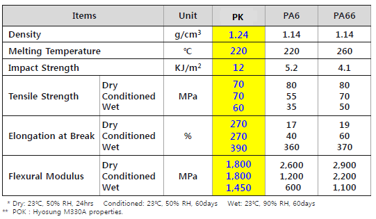 O PK é um polímero termoplástico de alta performance semicristalino produzido pela empresa Hyosung Polyketone, com a sede localizada na Coréia do Sul. Este material apresenta na sua cadeia principal apenas os carbonos, permitindo uma simetria molecular.