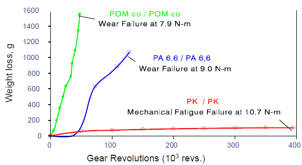 Uma outra propriedade em que o PK se destaca é a excelente resistência ao desgaste. No gráfico a seguir, pode-se notar que o PA 6 e 66 perdem mais massa do que o PK, resultado das revoluções de engrenagens, ou seja, as peças feitas em PK apresentaram uma durabilidade maior em contato com o agente abrasivo do que o PA 6 e 66, ou mesmo o POM (poliacetal), material conhecido por ter boa resistência a abrasão.