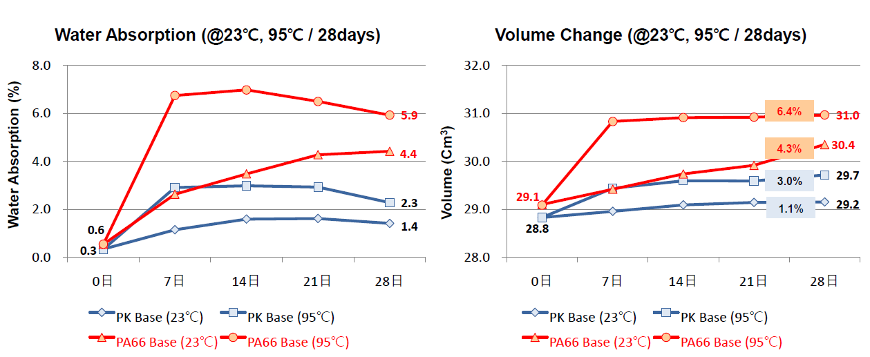 Os polímeros PK não são suscetíveis à hidrólise. Eles exibem resistência à hidrólise em uma ampla faixa de ambiente aquoso e absorvem pequenas quantidades de água, resultando em quase nenhum efeito na resistência e permite uma ótima estabilidade dimensional. Da tabela, é possível observar que a resistência ao impacto dos polímeros PK é excepcionalmente alta (mais que o dobro).